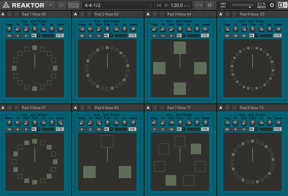 Euclidean Polyplexor: 8 Euclidean “Snaps-to-Keys” sequencers to drive Polyplex