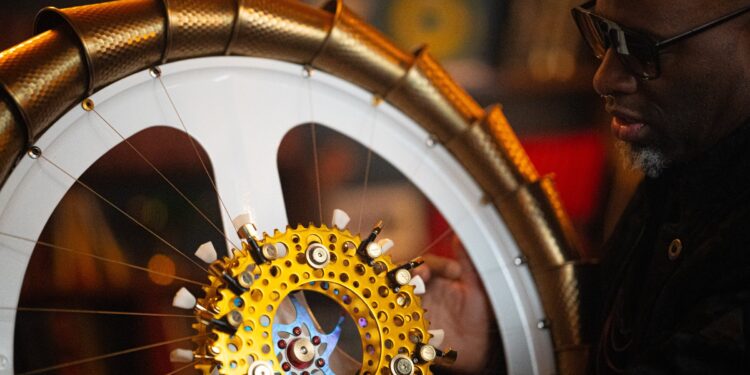You can pluck it, strike it, bow it, use your fingers, use a pick. The Lethelium is upcycled from bicycle parts and imagined in a cycle-punk zombie comic where bike parts save civilization. And all of this could only come from the imagination of Montreal artist Lateef Martin, an artist who lives a sci-fi reality others might only dream of. Or as Lateef puts it: “it reinvents the wheel.”