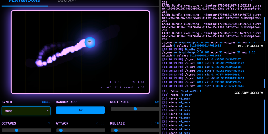 It’s the full SuperCollider synth, without the installation. You can add it to any site (self-hosted). It performs seamlessly via WebAssembly. But most importantly, it’s fun, colorful, and comes with examples and an OSC API so it can interface with live coding tools like Tidal (or your favorite). And you can mess around with it right now, for free.