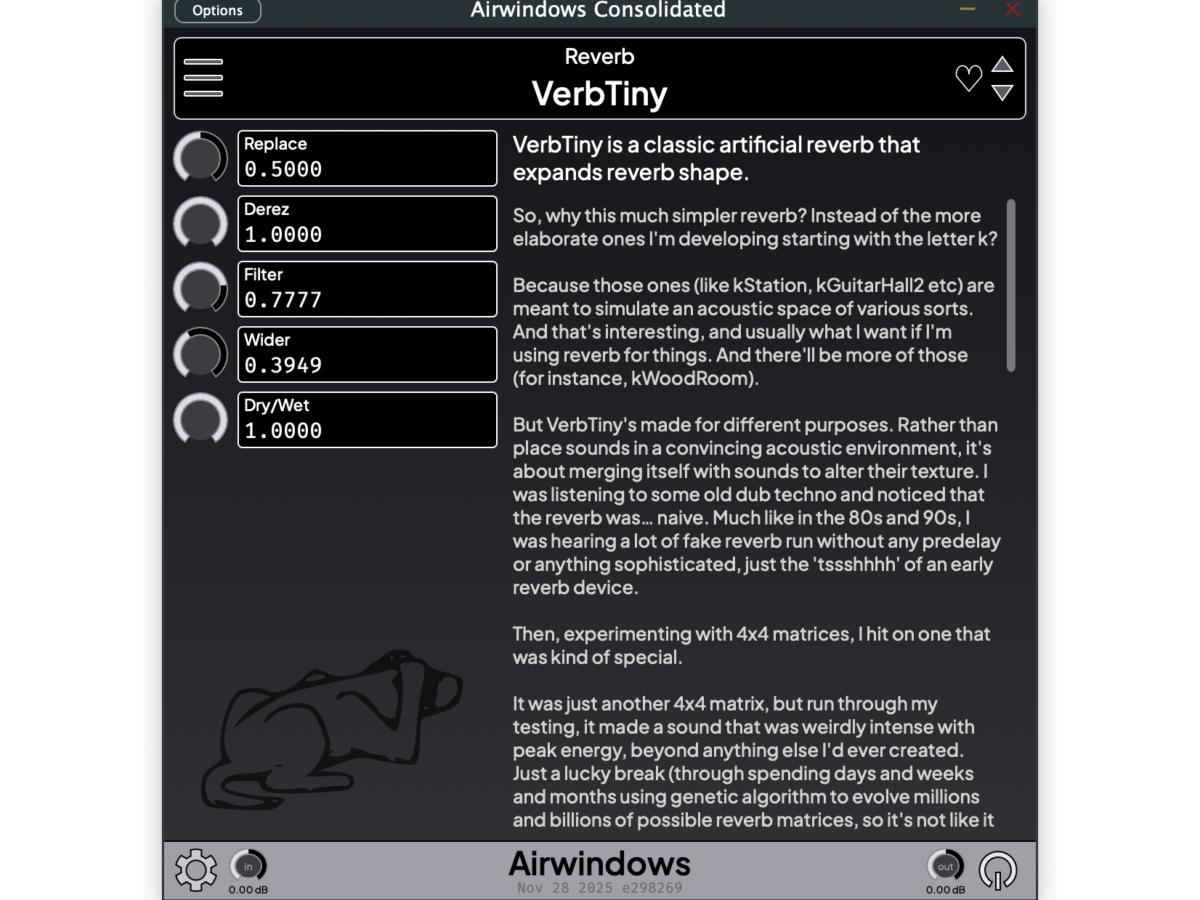 Read moreChris Johnson, aka Airwindows, continues to share his love for DSP with free tools, open source code, and elaborate discussions of the joy of crafting reverbs. So just in case you don’t feel blessed enough with free effects after SuperMassive’s new Sirius reverb/delay, here’s the tiny and the thick in all-new Airwindows editions. And they’ll even run in VCV Rack or on a Raspberry Pi.