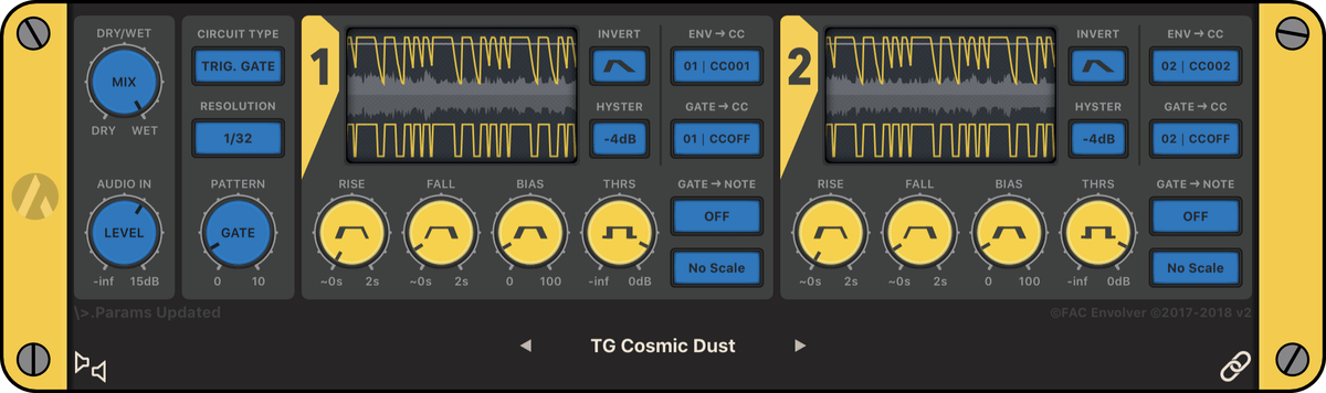 Fred Anton Corvest’s Envolver app takes a big step forward with version 2 which now works as an audio effect too with a follower noise gate and trance like trigger gate