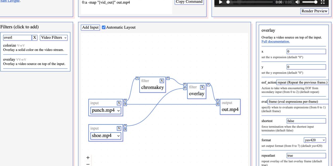 ffmpeg is a powerful but sometimes daunting free and open source video command line tool. Developer Sam Lavigne has found a way to make it easier to explore its complex filter processing tools – giving it a node-based patching interface for trying out filters in a browser. And Sam is looking for testers.