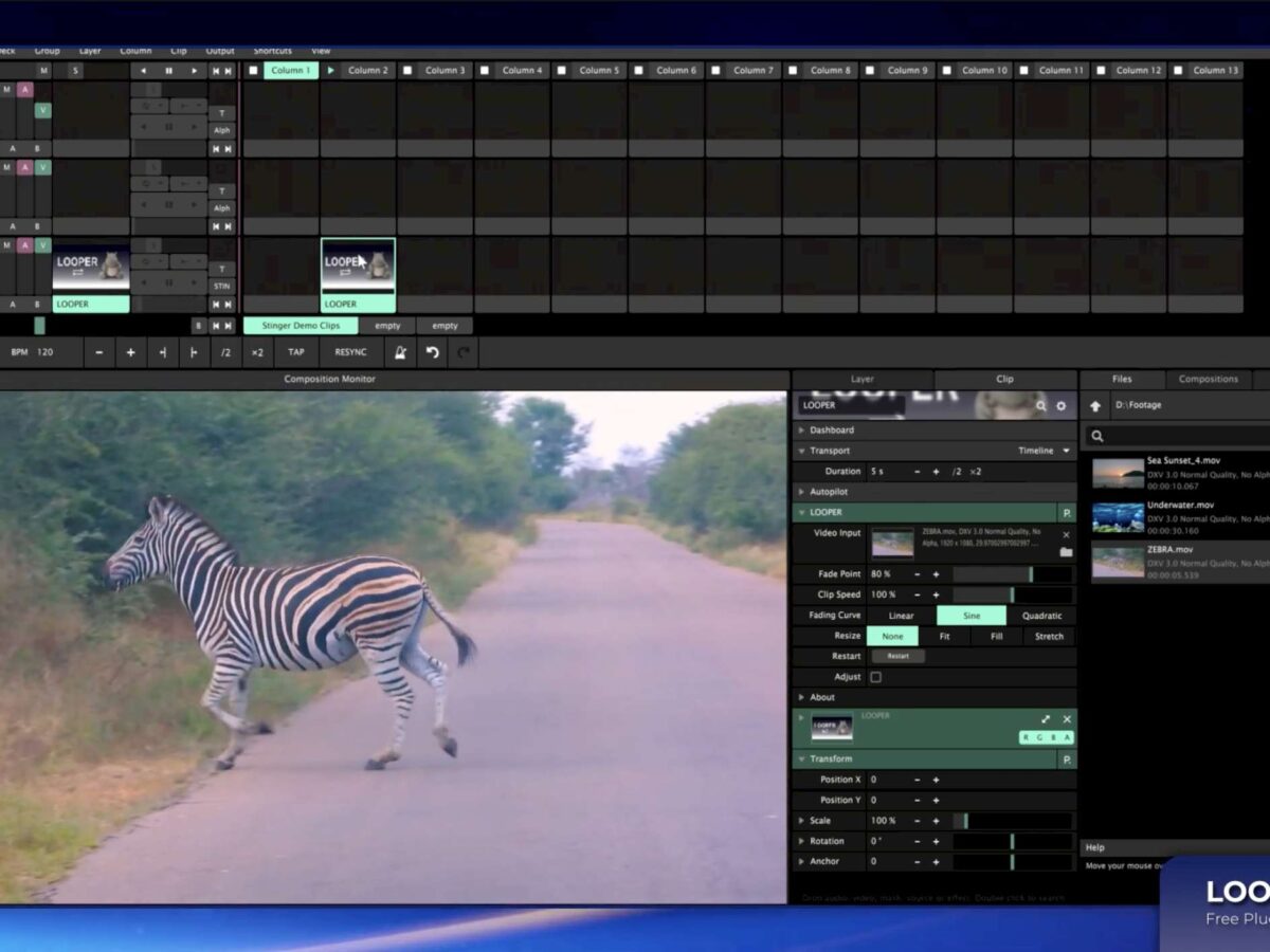 Drop a video clip into VJ/media server tools Resolume Arena or Avenue, hit loop, and now with this free add-on, get automatic crossfades for more seamless playback. Looper is the loop crossfading Resolume forgot, and it delivers perfectly.