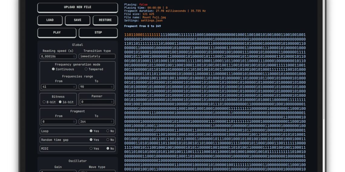 01000011 01101111 01101111 01101100 00100001! Binary Synth runs in your browser, and translates any binary file from its zeros and ones into audio synthesis and MIDI messages. The code is available under an MIT license, too, if you want to play with it.